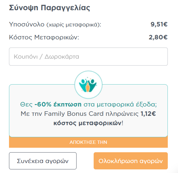 *Αν δεν επιθυμείς να φτάσεις στο τελευταίο στάδιο της παραγγελίας και βρίσκεσαι ήδη σε διαδικασία ολοκλήρωσης των αγορών σου, μπορείς να συνεχίσεις πατώντας «Δείτε το καλάθι». Στη σύνοψη της παραγγελίας σου δίνεται ξανά η δυνατότητα να εξαργυρώσεις το κουπόνι ή τη δωροκάρτα σου.