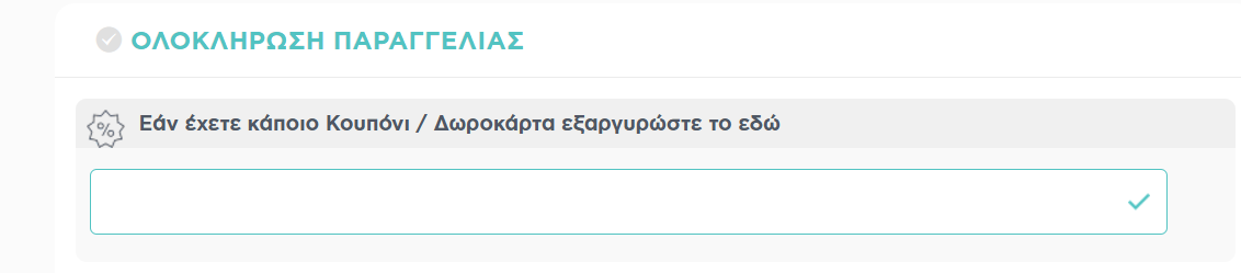 Στο τρίτο και τελευταίο στάδιο πριν την ολοκλήρωση της παραγγελίας, στο πεδίο «Εάν έχετε κάποιο κουπόνι / δωροκάρτα εξαργυρώστε το εδώ», μπορείς να εισάγεις τον εκπτωτικό σου κωδικό. Απλά πληκτρολόγησε τον κωδικό και μέσα σε λίγα δευτερόλεπτα, θα εμφανιστεί αυτόματα το νέο σύνολο της παραγγελίας σου. Οι προωθητικές ενέργειες δεν αθροίζονται ή συνδυάζονται, επομένως, για κάθε παραγγελία μπορείς να χρησιμοποιήσεις μόνο μία δωροκάρτα/κουπόνι. Βρες περισσότερες πληροφορίες για τη δωροκάρτα εδω!